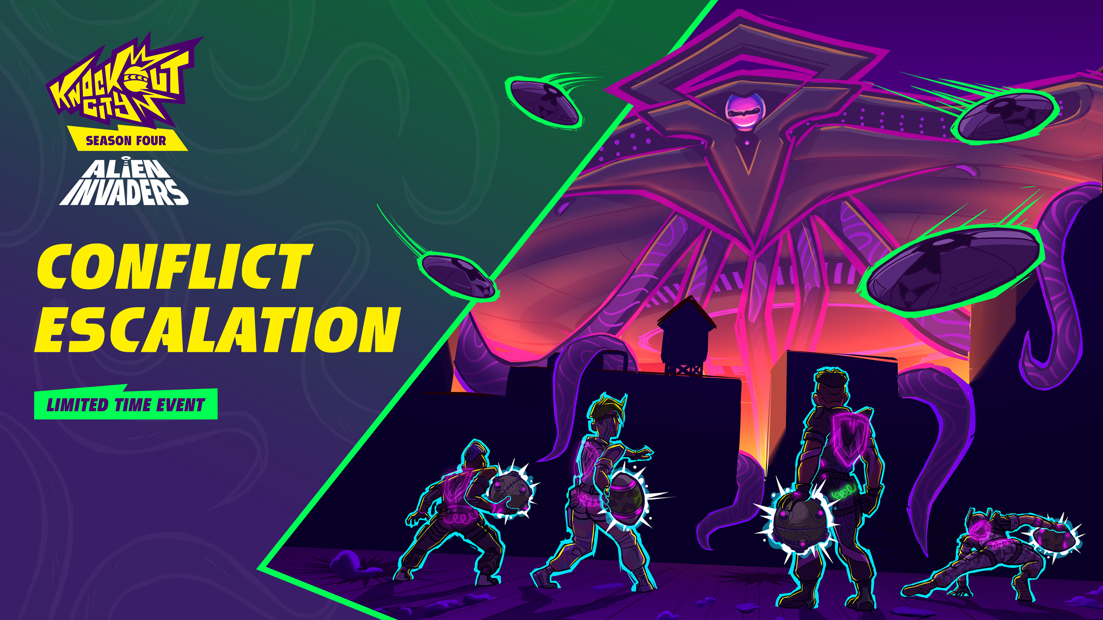 This is not a drill! Alien Invaders have landed in the outskirts of Knockout City! Man, I wish I had joined that Doomsday Prep group now. It’s unclear what they want or why they’re here, but it doesn’t look good. We’re about to show them whose city this is. It’s time for a Conflict Escalation, arriving in Knockout City on Tuesday, December 7th at 12pm (noon) UTC!