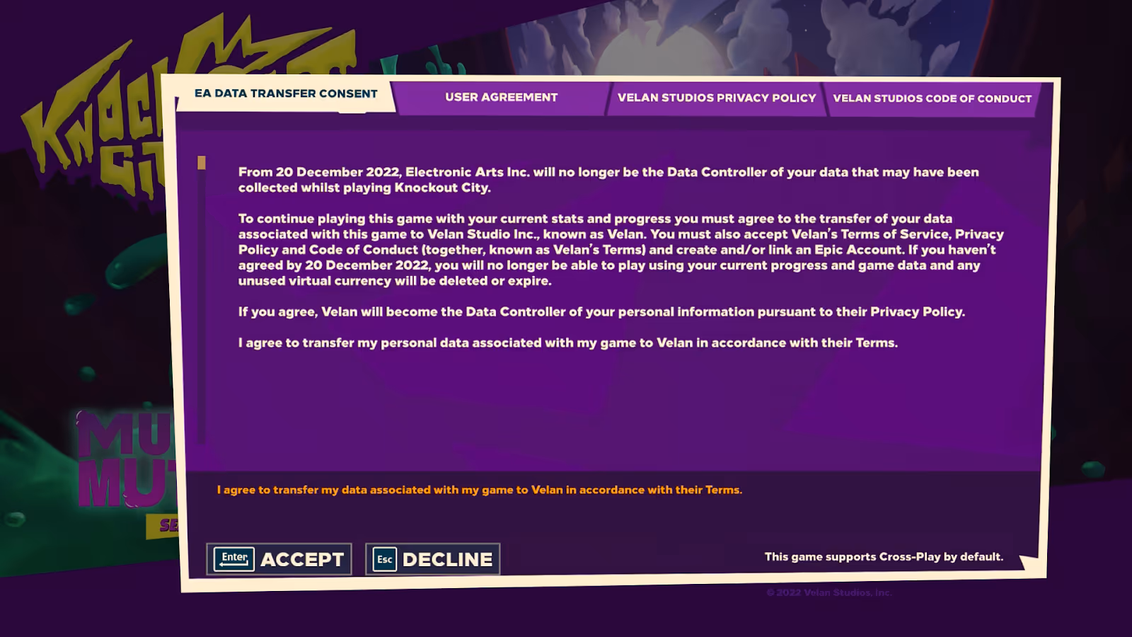 Our previous blog post about this explained a little, but what exactly happens after our 7.1 update rolls out? The first time you log in to Knockout City after the patch, you’ll see this screen, which prompts you to agree to transfer ownership of your game data from EA to Velan (note, Velan will own all of your game data moving forward, not Epic).