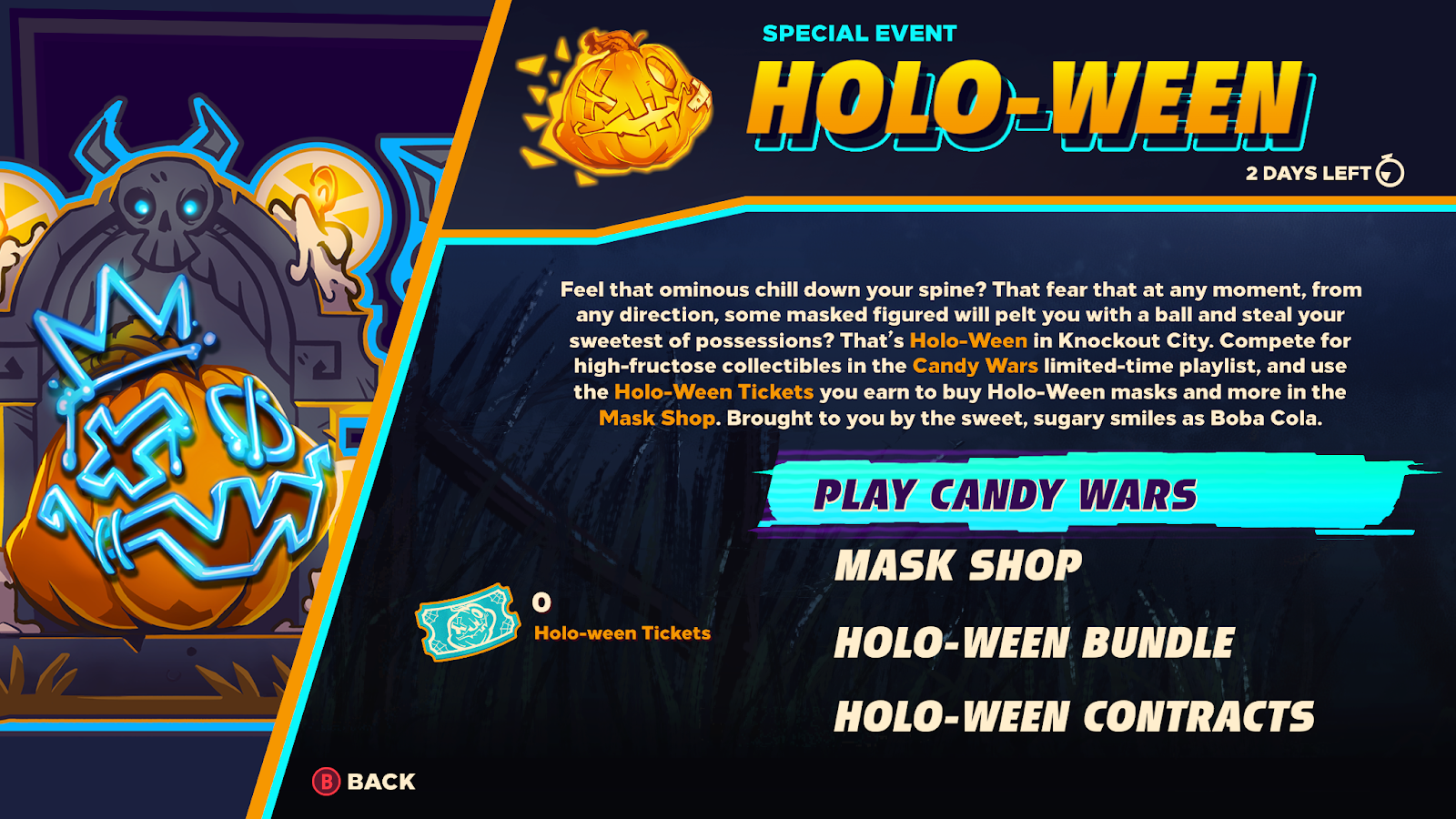 Track your progress as you brawl your way through the Holo-Ween Contracts and earn Holo-Ween tickets to use in the Mask Shop. Some contracts you’ll complete for playing Candy Wars, others require you to wear a mask and scare up some wins in whatever Playlist you choose. Smash that last contract, and you’ll take home the Legendary Face Melt Taunt, not available anywhere else.