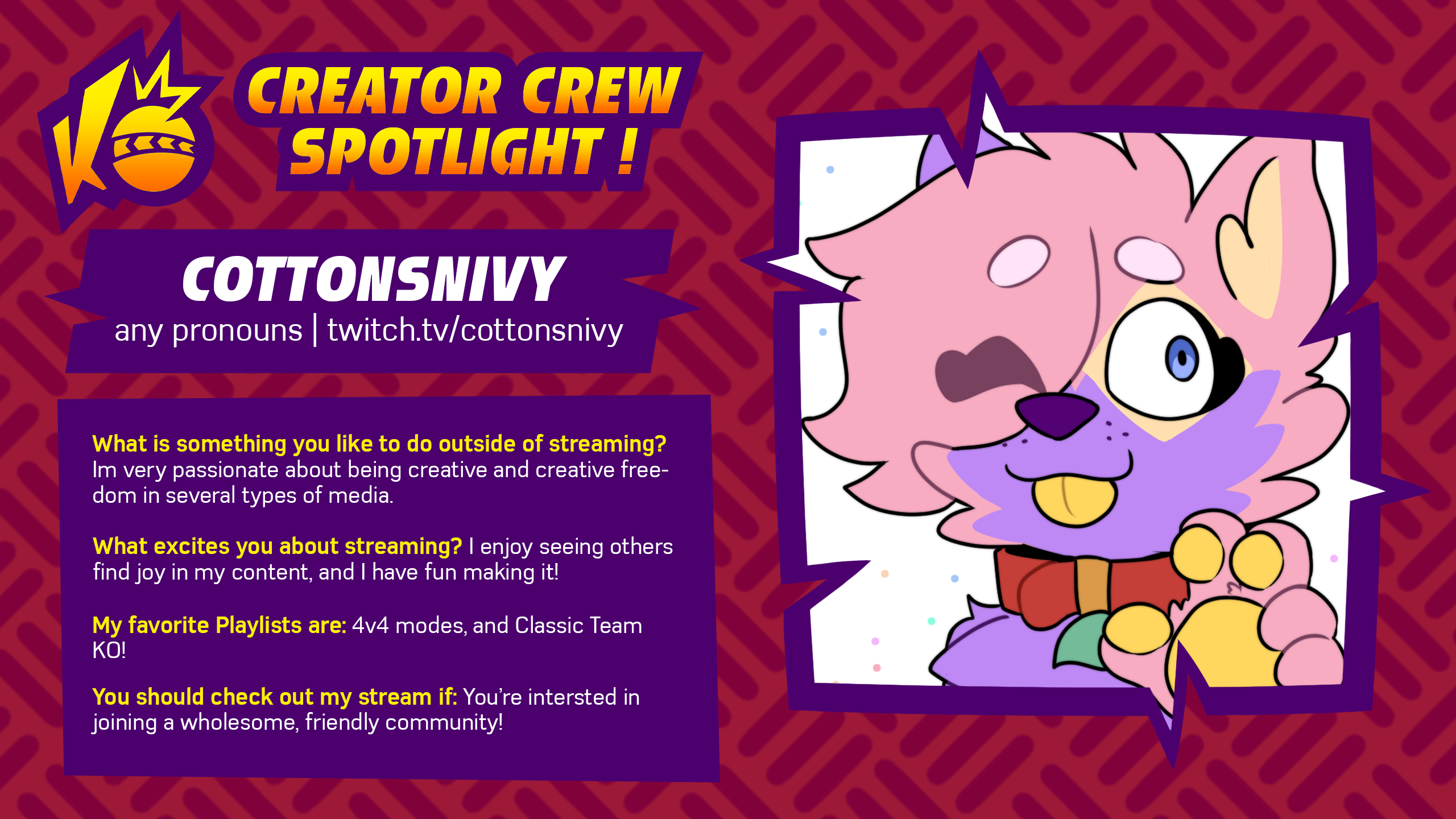 Let’s take a moment and applaud the awesome members of our Creator Crew, working extra hard to bring you quality Knockout City content daily! This issue, meet CottonSnivy in the mini-interview below. Get to know them even better on the dodgebrawl battlefield, or better yet, on their Twitch streams!