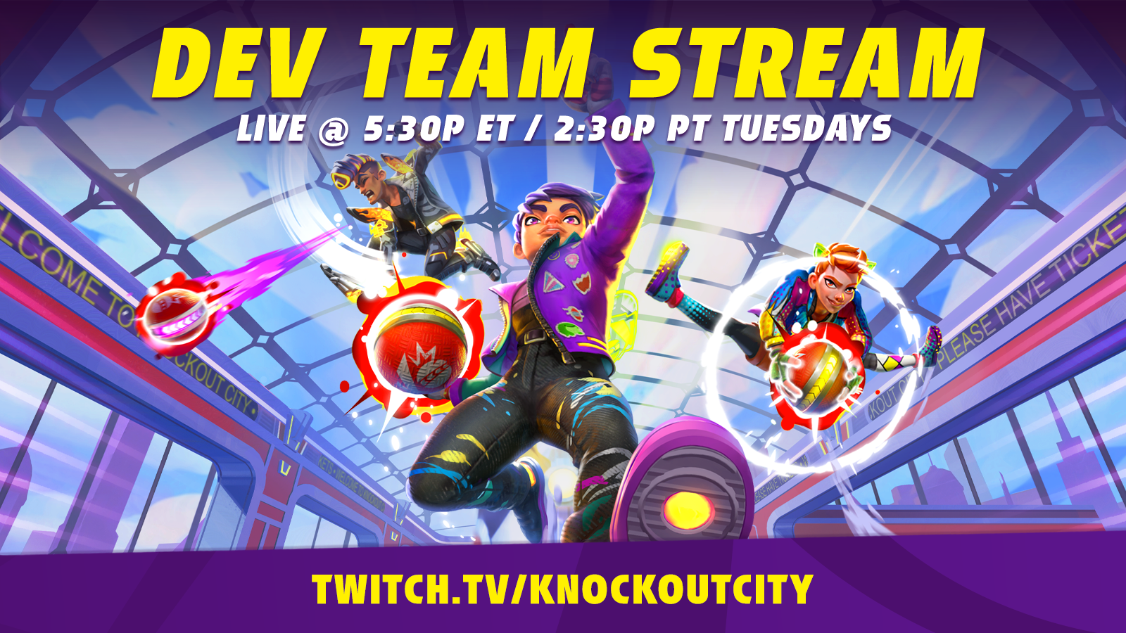 Did you know that every week, the Devs behind Knockout City stream that week’s new playlist live on Twitch? Sometimes, we even ask for players to drop their KO City IDs in chat and choose people to play live at random! Tune in each week at 5:30pm ET, chat with Lynn and Josh, and enter in our raffle to win Style Chips, Holobux or other giveaways!