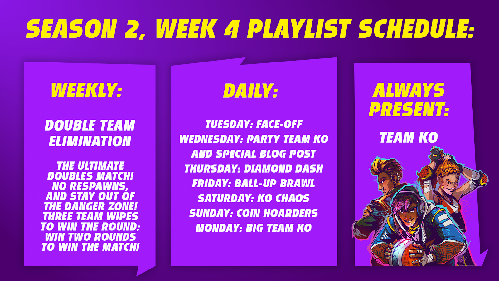 Listen up, devious duos, you’re about to be elated, because all this week, you and your bestie Crewmate will be skipping into matches, holding hands, weaving flower baskets, and of course, landing KOs. Introducing: Double Team Elimination: Two teams enter, one team leaves, with no respawns each round. Each team wipe will win you a point; first team to three points wins the round. Win two rounds to walk away victorious and show off that Victory Pose. Best be on your toes, because that Danger Zone will creep up and keep things interesting! For our Daily Playlist rotation, you’ll have to check out this handy graphic: