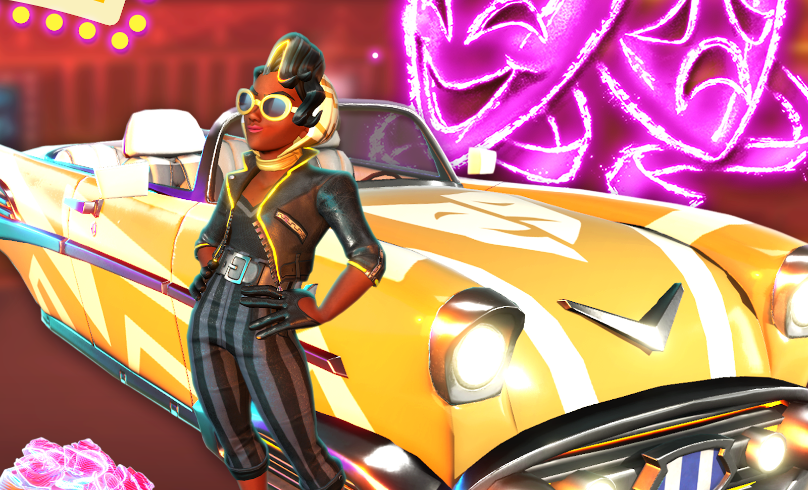 Welcome to the Knockout City Home Shopping Network, where we preview tomorrow’s bundle today! And what have we here? The Drama Queen bundle is a must-have for the brawler who’s a little extra out there. Why just throw dodgeballs at your opponents when you can land them with a lasting memory? This limited time bundle comes with the Driving Scarf hairstyle, Black Padded Driving Gloves (so posh!), Gilded Glasses (all the better to peer at the other team over), Rose Bouquet Ultimate Hologram (say it with flowers!), Drama Masks KO Effect and Comedy and Drama Player Icon (drama doesn’t mask anything, dahling. Drama is life), Keep it Coming MVP Pose (that pose you practiced in the mirror all those times is finally paying off!), and the Drama Driver Crew Vehicle so you can cruise around in style!