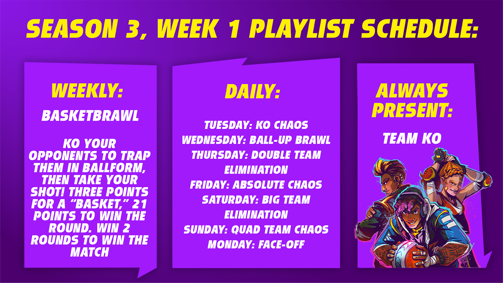 Season Three’s daily Playlists will continue to rotate through your favorites! Pop in daily to claim your Daily Login Bonus and play a round or two of that day’s featured mode. Here’s what you can look forward to in Week 1:
