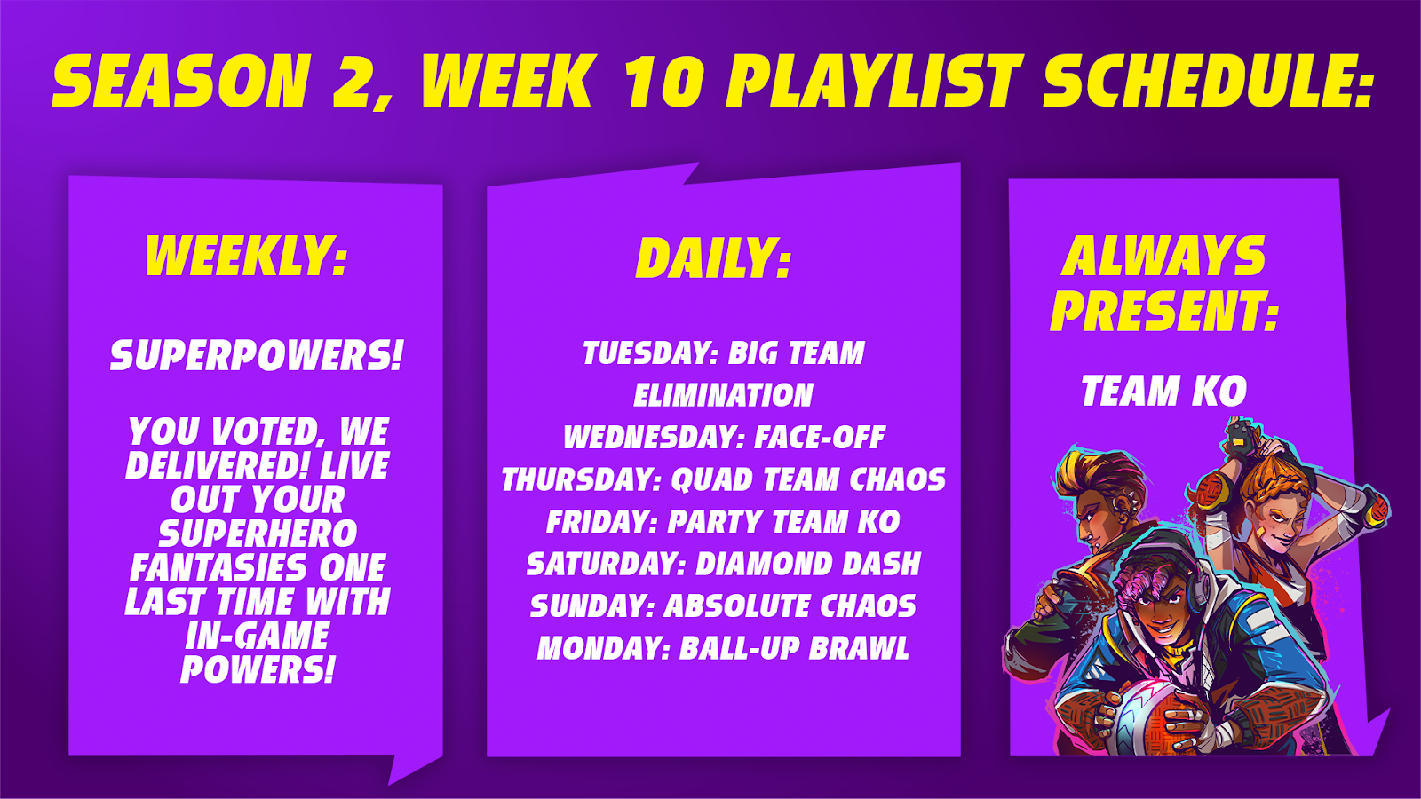 The community has spoken, and their voices are united! Superpowers! won the Players Choice vote with a resounding 48% of the vote. Guess y’all just can’t get enough of those tainted Boba Colas, huh? By the end of the Knockout City Heroes event, there was a ton of discussion around the Superpowers! meta, how to coordinate with teammates and best use your powers to ensure victory over the other team. Use your X-Ray powers to call out enemy locations to your teammates, use Super Ballform Bounce creatively in areas with lower ceilings to ensure your Ult hits a little harder, and pair Super Charge-Up with Sniper Ball. Because, of course. If you enjoyed Superpowers! you’re going to love the events that we’ve got in store for you in Season 3. In the meantime, here is your Playlist schedule for week 10!
