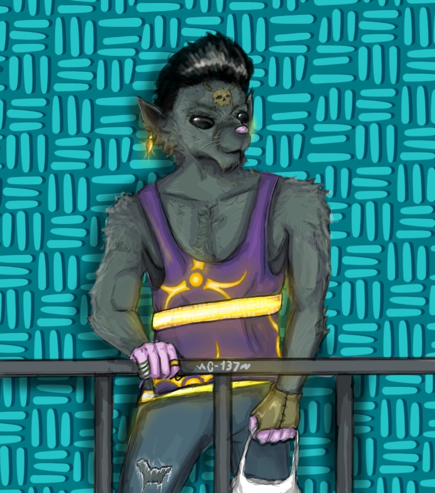 Now titled “Ratfink Fanart”, this piece is a bold imagining of a rat-human-mutant that shares the actual Ratfink’s same pompadour hairdo and sewer-chic tank top. And did you catch the dodgeball-inspired pattern background?