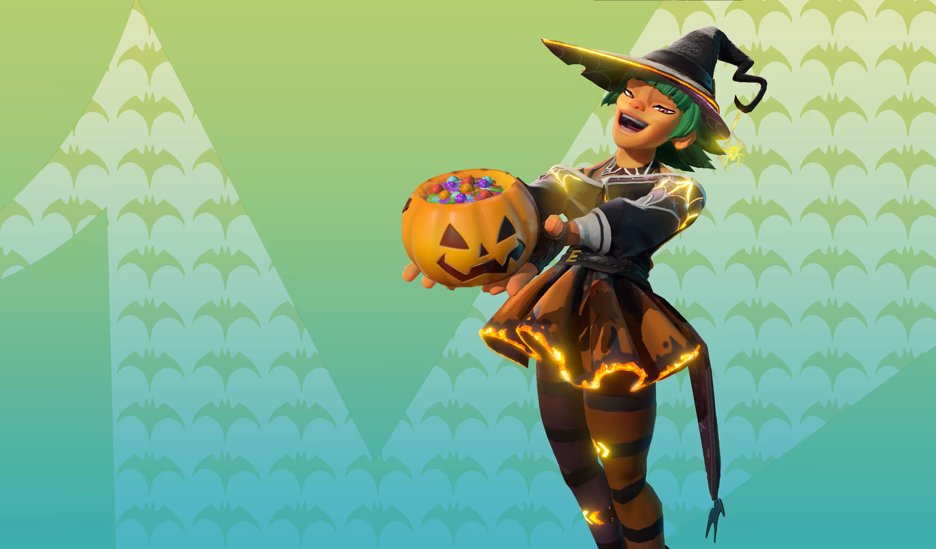 Do you believe in magic? Well, I got no choice, I’m a walking skeleton. Magic’s literally holding me together. But if your unimaginative brain needs more convincing, then summon up the Holo-Ween Havoc Bundle in the Brawl Shop, only available during Holo-Ween! That enchanting pointy hat means magical business, and 2400 Holobux will net you the complete spellcasting set: