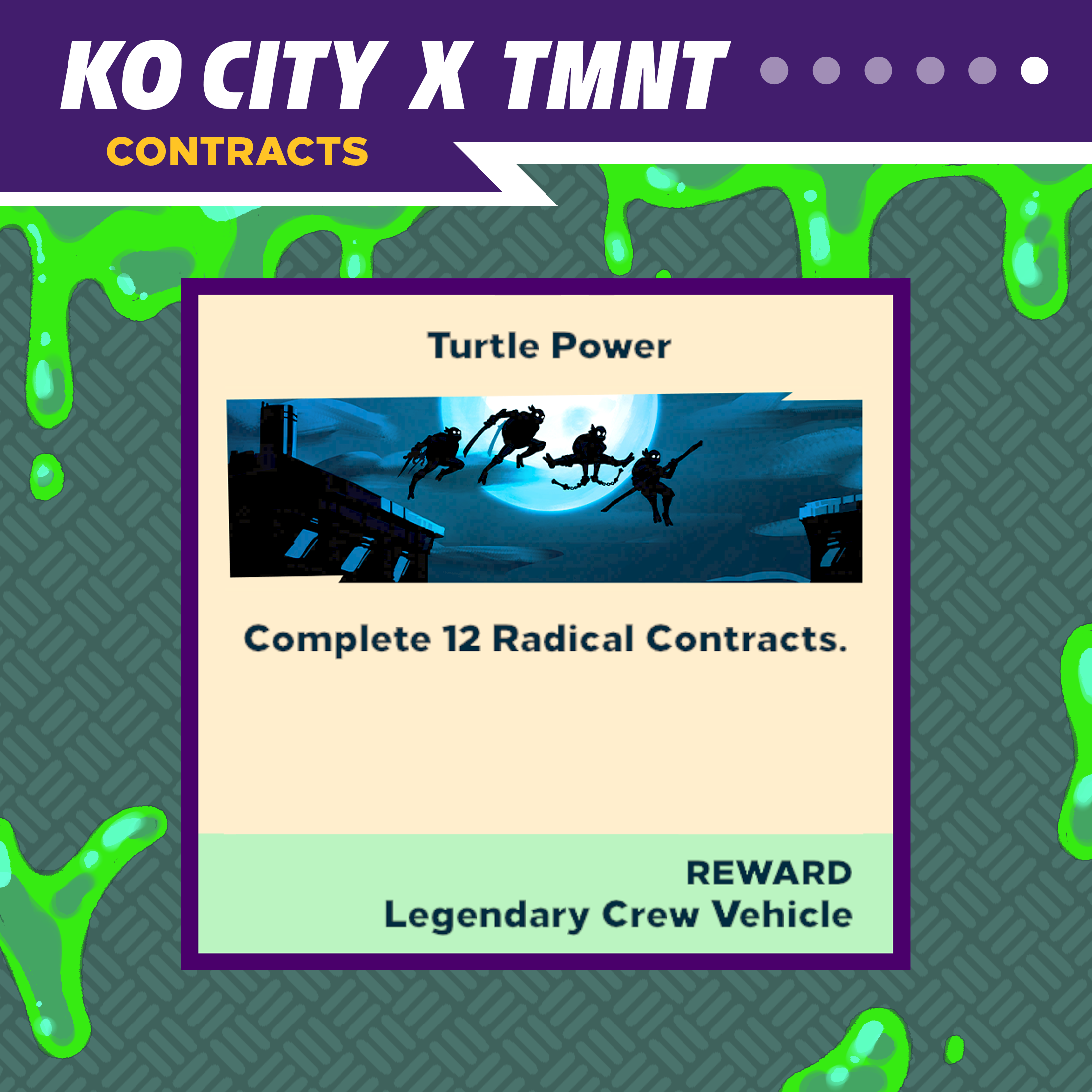 Every two completed Contracts will earn you a TMNT reward! At two, four, six, and eight Contracts completed, you’ll earn a Legendary Player Icon featuring Leo, Donnie, Raph, and Mikey. Finishing ten Contracts lets you rock the Heroes in a Half Shell as a Legendary Crew Banner, with Fearsome Fighting Team. And finally, completing 12 will net you one rockin’ reward: the exclusive Legendary Crew Vehicle, the Party Wagon! It's the Turtles’ own green-and-yellow set of wheels, and it’s all yours to keep your Crew’s party going forever!